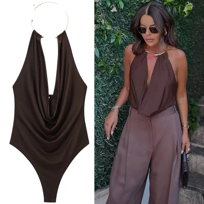 Descubra o Body Feminino Frente Única com Decote Drapeado - Leonor, a peça essencial para o seu guarda-roupa de verão. Este bodysuit marrom, com seu design off-shoulder e costas abertas, oferece um toque de sofisticação e ousadia para qualquer ocasião.