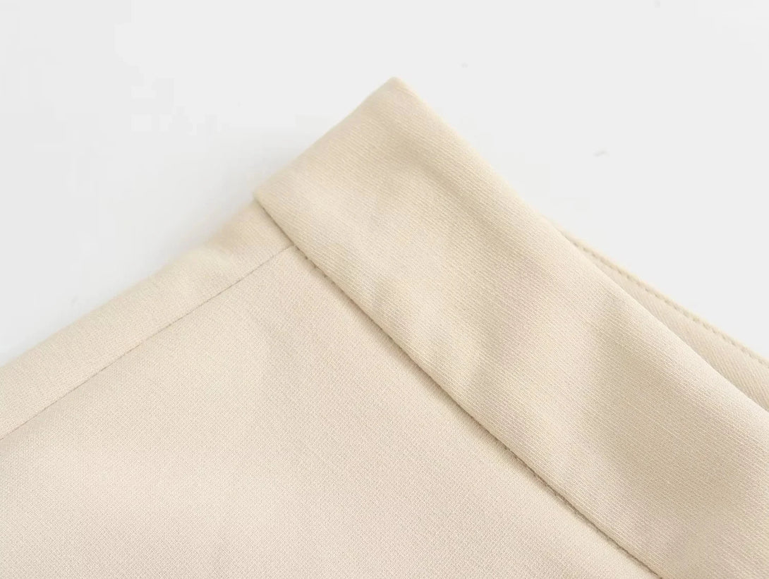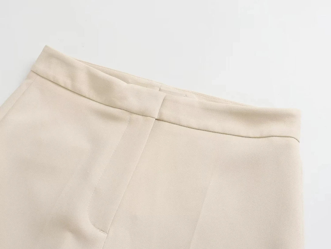 - Calça com Fenda Lateral: As calças de cintura alta alongam a silhueta e a fenda lateral proporciona um toque de ousadia e movimento.