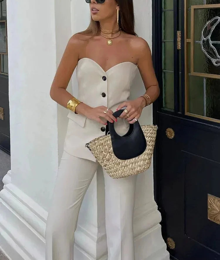Conjunto Feminino Alfaiataria Elegante Colete Ombro a Ombro e Calça