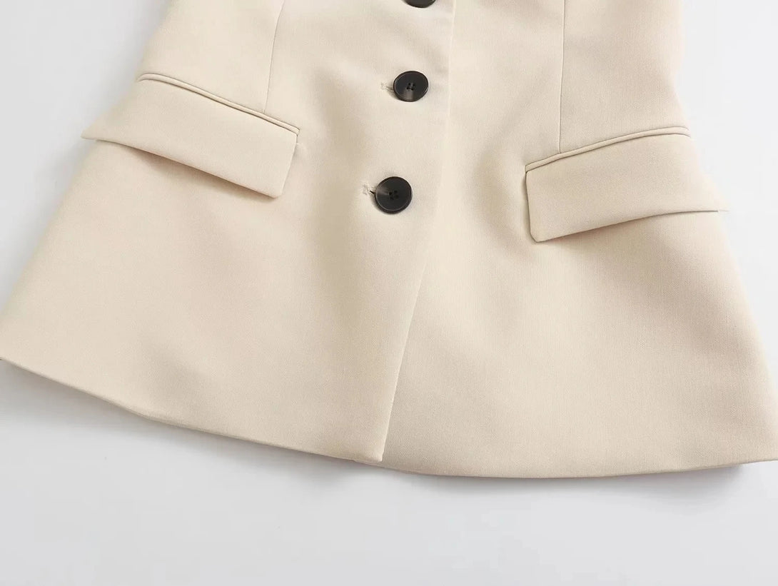- Design Sofisticado: A regata sem alças realça sua silhueta de forma elegante, enquanto os botões adicionam um charme clássico.