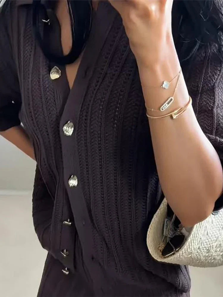 Apresentamos o Conjunto Elegante de Malha Feminina, a escolha perfeita para a mulher moderna que busca aliar estilo e conforto em um só look. Este conjunto é composto por uma camisa de manga curta com design de botões e calças largas, ideal para a temporada de primavera/verão.