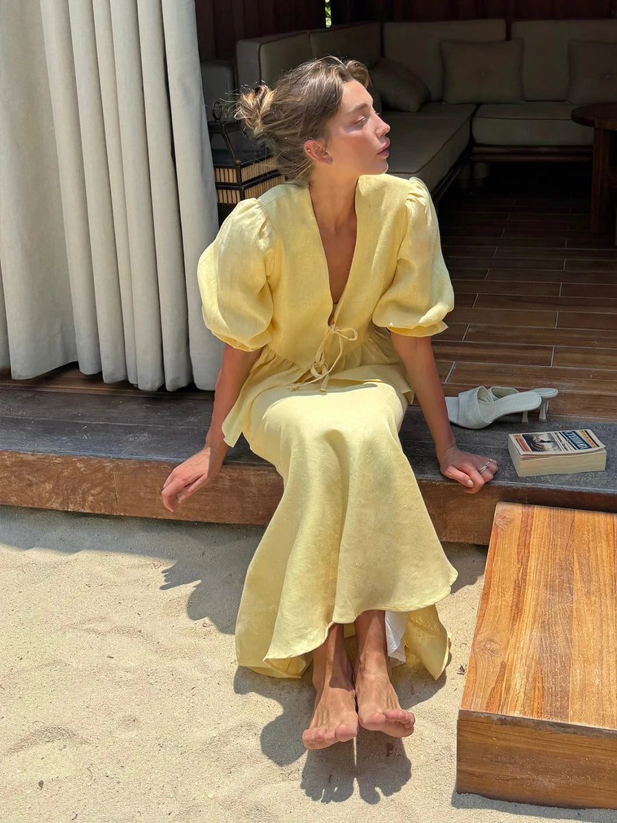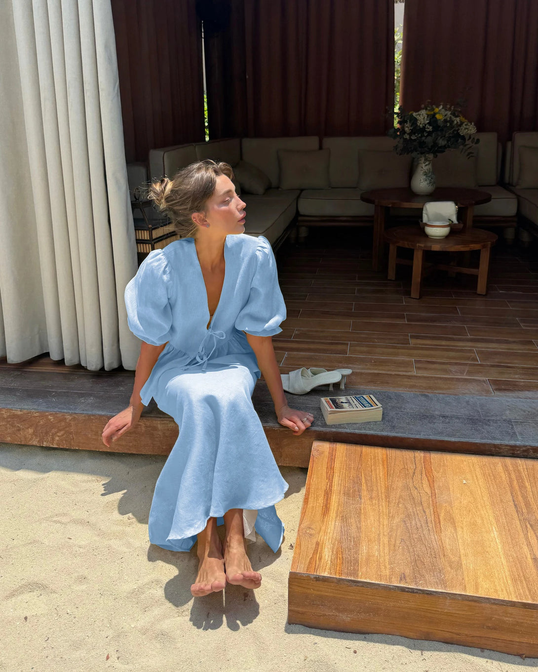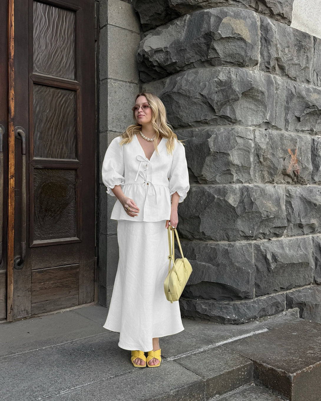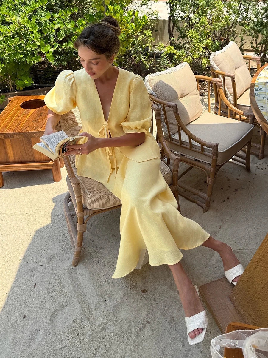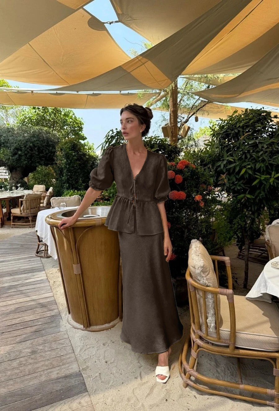 Conjunto Feminino Elegante de Verão com Manga Puff e Saia Longa
