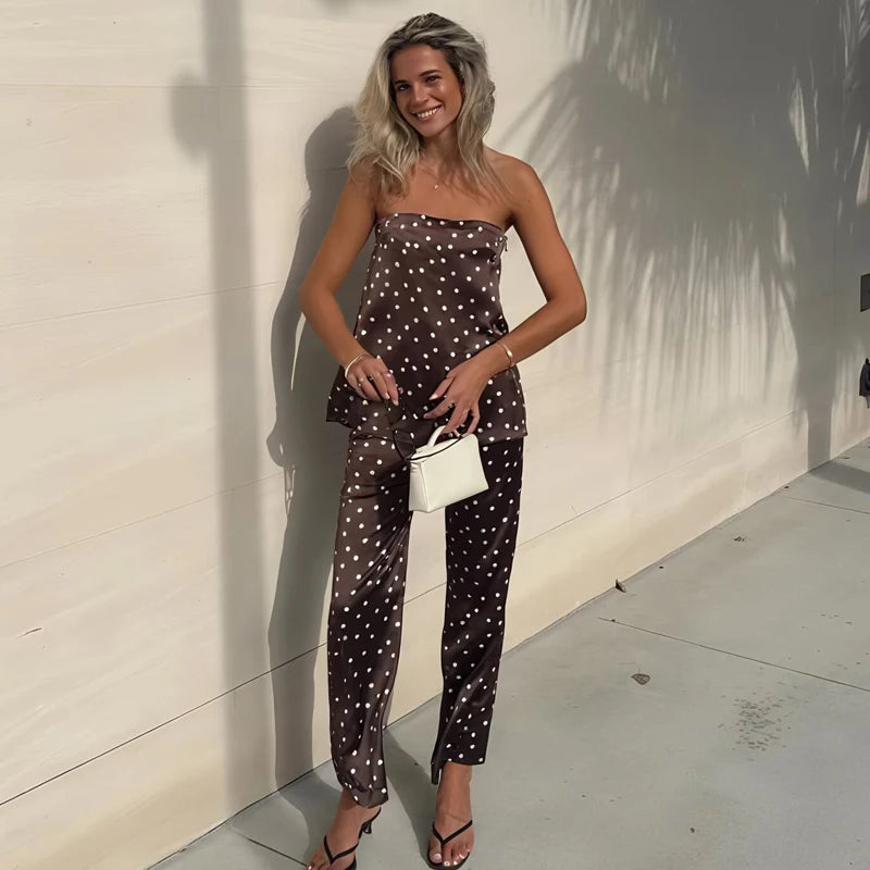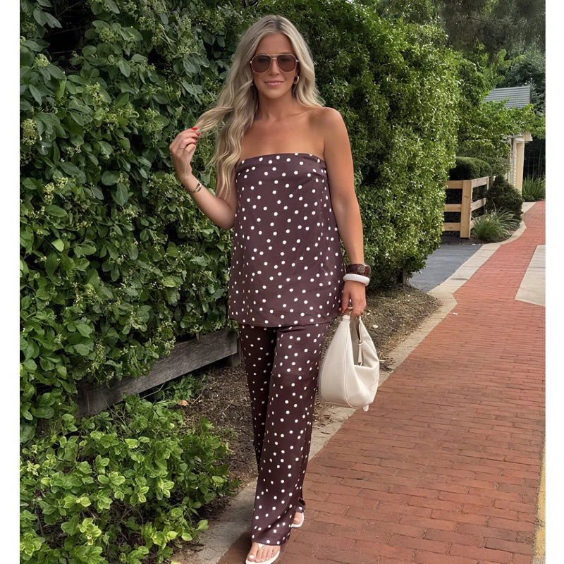 Conjunto Feminino Elegante Poá Blusa Ombro a Ombro e Calça