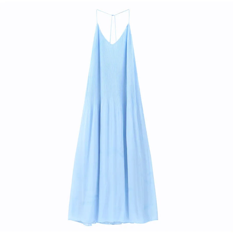 Vestido Longo Azul Plissado Frente Única Elegante e Sensual